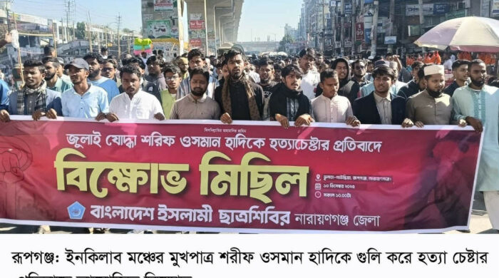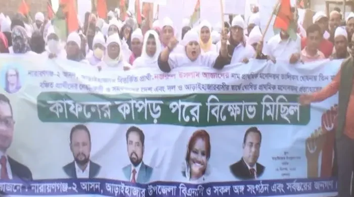 নারায়ণগঞ্জ-২ (আড়াইহাজার) আসনে বিএনপির মনোনীত প্রার্থী পরিবর্তনের দাবিতে মনোনয়ন বঞ্চিত তিন নেতার কর্মী-সমর্থকরা কাফনের কাপড় পরে বিক্ষোভ মিছিল ও সমাবেশ করেছেন। মঙ্গলবার (৯ ডিসেম্বর) বিকালে মিছিলটি উপজেলা সদর থেকে বের